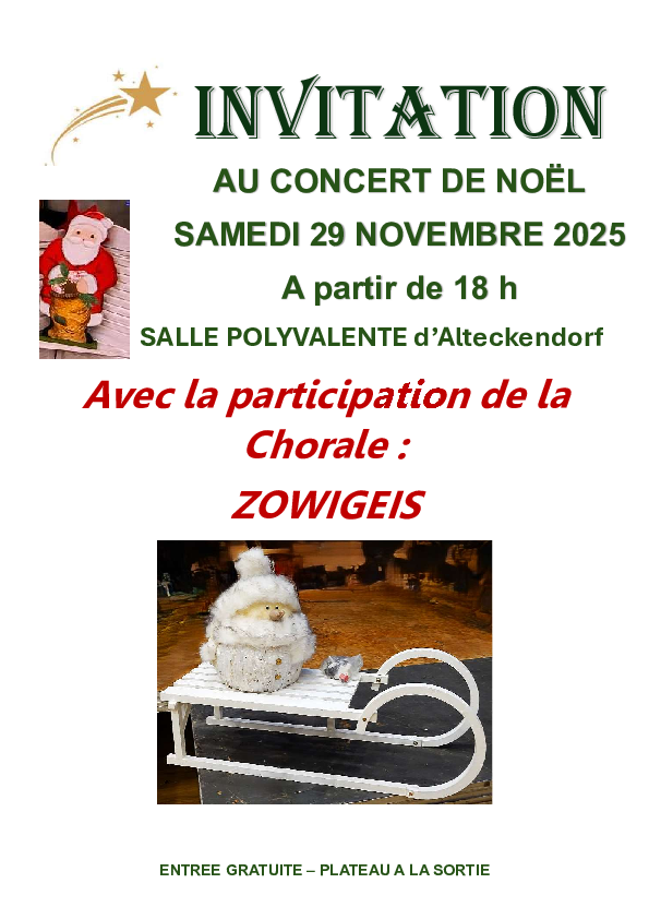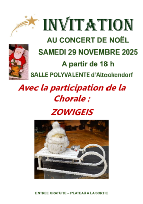 La Paroisse protestante d'Alteckendorf vous invite à son concert de Noël, avec la participation de la Chorale ZOWIGEIS